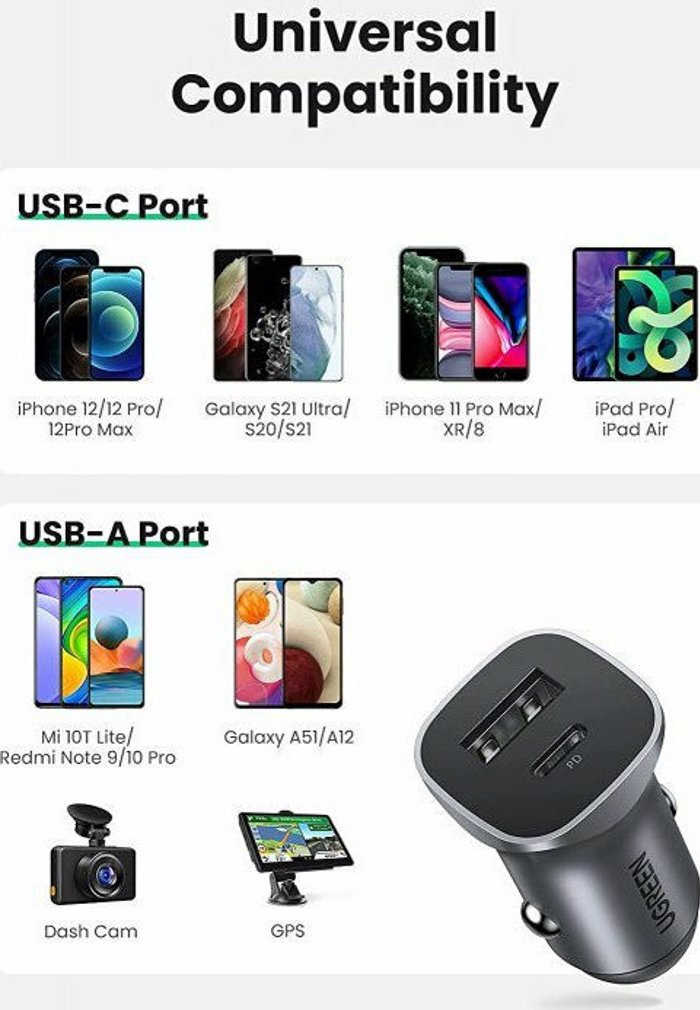 Car Charger UGREEN CD130 24W PD+USB QC3.0 Silver 30780