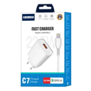 Ο ταχυφορτιστής Jellico C7 είναι εξοπλισμένος με θύρα USB διασφαλίζoντας την ασφάλεια χρήσης χάρη την τεχνολογία του. Είναι συμβατός με τις πιο δημοφιλείς συσκευές και σίγουρα θα σας φανεί πολύ χρήσιμος! Μπορείτε να φορτίζετε τις συσκευές σας έως και 3 φορές πιο γρήγορα από το συνηθισμένο. Το προϊόν υποστηρίζει πρωτόκολλα γρήγορης φόρτισης, όπως το Quick Charge 3.0. Μπορεί επίσης να φορτίσει έως και 18 W. Θα θέλατε να δείτε πόσο γρήγορα λειτουργεί ο φορτιστής; Συνδέστε το smartphone σας σε αυτό και απολαύστε μια ταχύτατη φόρτιση!