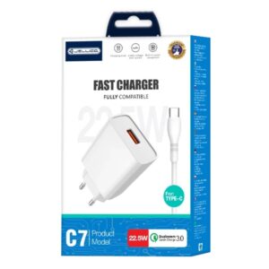 Ο ταχυφορτιστής Jellico C7 είναι εξοπλισμένος με θύρα USB διασφαλίζoντας την ασφάλεια χρήσης χάρη την τεχνολογία του. Είναι συμβατός με τις πιο δημοφιλείς συσκευές και σίγουρα θα σας φανεί πολύ χρήσιμος! Μπορείτε να φορτίζετε τις συσκευές σας έως και 3 φορές πιο γρήγορα από το συνηθισμένο. Το προϊόν υποστηρίζει πρωτόκολλα γρήγορης φόρτισης, όπως το Quick Charge 3.0. Μπορεί επίσης να φορτίσει έως και 22.5 W. Θα θέλατε να δείτε πόσο γρήγορα λειτουργεί ο φορτιστής; Συνδέστε το smartphone σας σε αυτό και απολαύστε μια ταχύτατη φόρτιση!